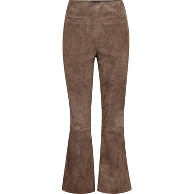 Lekker semsket skinn bukse med stretch . Flare ned , 7/8 lengde. en super lekker bukse som går til hele årets farger uansett. 100% skinn
