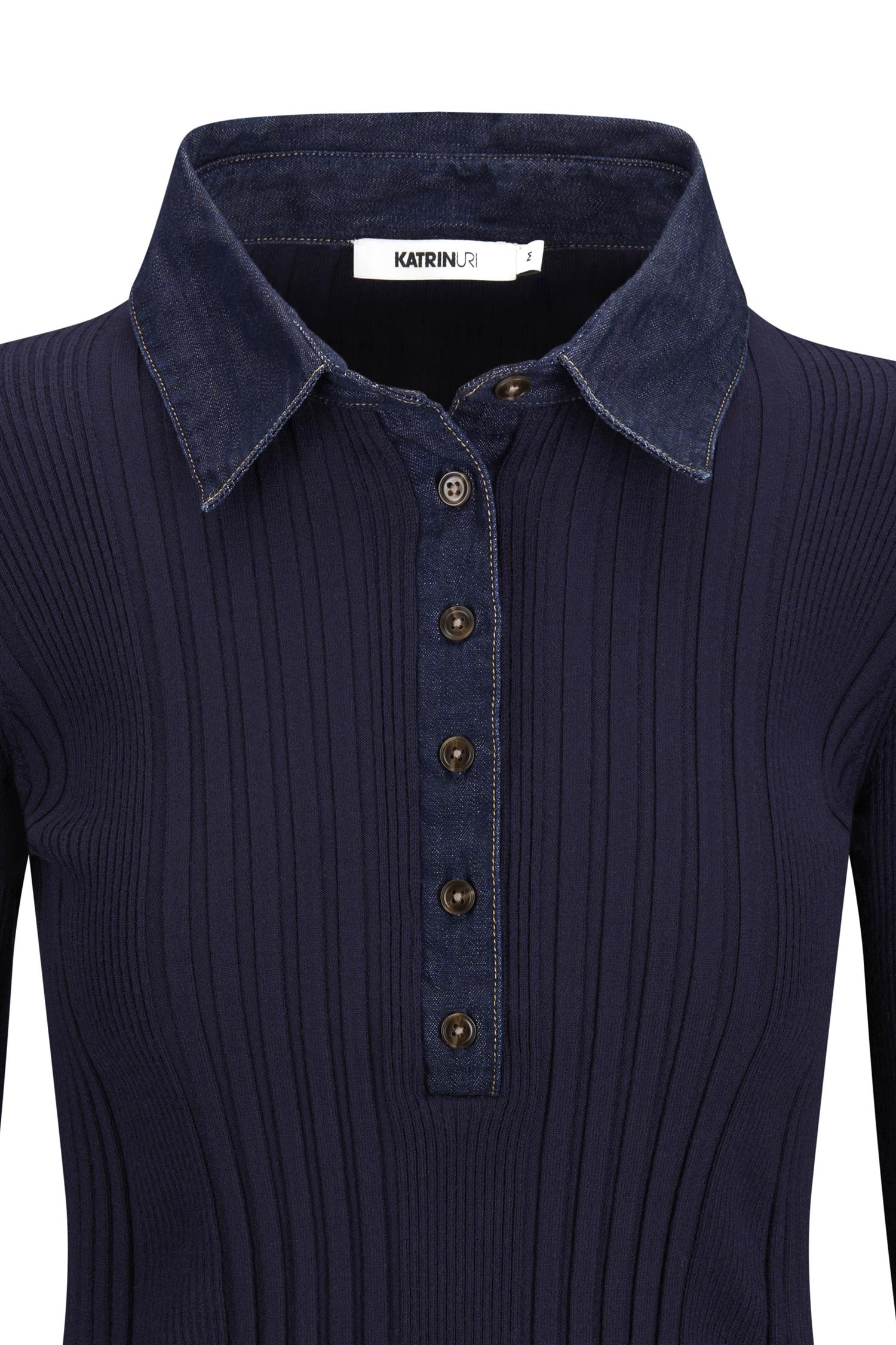 Den gode viskosegenseren har krage i denimstoff, med knepping i front. Er strikket i smal rillestrikk, er vanlig i størrelse, smal fasong.