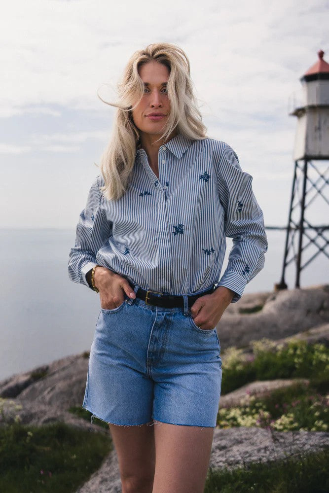 Ida Maja Shirt STP EMB fra Raus er en skjorten med klassisk og feminint uttrykk. Blusen har smale blå striper og brodert blomstermønster. Den har lange ermer med mansjetter, knappelukking hele veien ned i front og en rett passform som gir et tidløst uttrykk. Laget i 100% bomull som føles behagelig mot huden. Skjorten har nomal i passform og er perfekt både til hverdags og mer pyntede anledninger