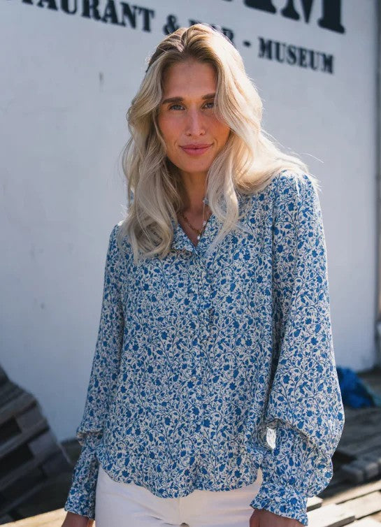 Astrid Shirt er den ultimate vår og sommerblusen fra Raus, og et must-have i garderoben! Blusen har en flatterende passform med lange ermer og knappelukking hele veien i front. Den søte kragen med volanger og de delikate knappene i kragen gir blusen et lekent og feminint preg. Det blå blomsterprintet vil være et herlig tilskudd til garderoben. Blusen er laget i en viskosemiks som føles meget myk og behagelig på.